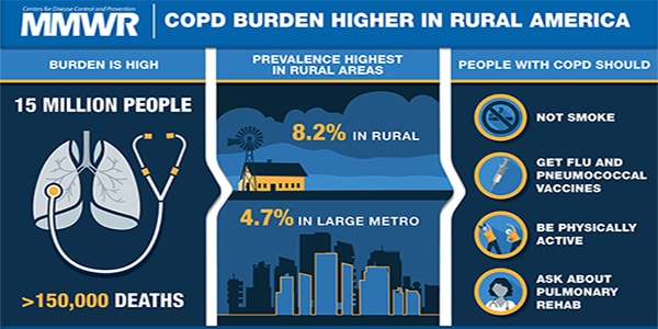 In 2015, rural U.S. residents experienced higher age-adjusted COPD prevalence, Medicare hospitalizations for COPD as the first-listed diagnosis, and deaths caused by COPD than did residents in micropolitan or metropolitan areas. In addition to the major risk factors for COPD, which include tobacco smoke, environmental and occupational exposures, respiratory infections, and genetics, correlates include older ages, low socioeconomic status, and asthma history (5,6). Rural populations might have higher COPD risk because these populations have a greater proportion with a history of smoking (3), more secondhand smoke exposure but less access to smoking cessation programs,§§ and higher proportions of uninsured or lower socioeconomic residents, which might have limited access to early diagnosis, treatment, and management of COPD.¶¶ Rural respiratory exposures might include mold spores, organic toxic dust, and nitrogen dioxide, which are associated with COPD risk (7).