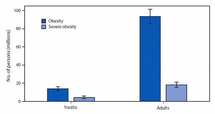 During 2015–2016, in the United States, there were 13.7 million youths (18.5%) with obesity, including 4.2 million youths (5.6%) with severe obesity. During this same period, in the United States, there were 93.3 million adults (39.8%) with obesity, including 17.8 million adults (7.6%) with severe obesity.