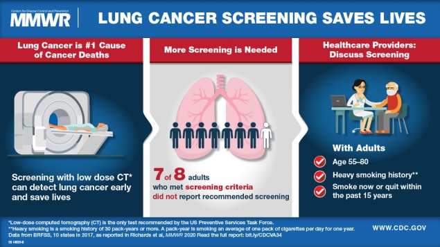 Lung cancer is the leading cause of cancer death in the United States; 148,869 lung cancer-associated deaths occurred in 2016 (1). Mortality might be reduced by identifying lung cancer at an early stage when treatment can be more effective (2). In 2013, the U.S. Preventive Services Task Force (USPSTF) recommended annual screening for lung cancer with low-dose computed tomography (CT) for adults aged 55–80 years who have a 30 pack-year* smoking history and currently smoke or have quit within the past 15 years (2). This was a Grade B recommendation, which required health insurance plans to cover lung cancer screening as a preventive service.§ To assess the prevalence of lung cancer screening by state, CDC used Behavioral Risk Factor Surveillance System (BRFSS) data collected in 2017 by 10 states.** Overall, 12.7% adults aged 55–80 years met the USPSTF criteria for lung cancer screening. Among those meeting USPSTF criteria, 12.5% reported they had received a CT scan to check for lung cancer in the last 12 months. Efforts to educate health care providers and provide decision support tools might increase recommended lung cancer screening.