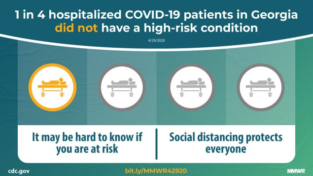 This report characterizing a cohort of hospitalized adults with COVID-19 in Georgia (primarily metropolitan Atlanta) found that most patients in the cohort were black, and black patients had a similar probability of receiving IMV or dying during hospitalization compared with nonblack patients. Although a larger proportion of older patients had worse outcomes (IMV or death), a considerable proportion of patients aged 18–64 years who lacked high-risk conditions received ICU-level care and died (23% and 5%, respectively). Estimated case fatality among patients who received ICU care was high (37%–49%) but comparable with that observed in a smaller case series of COVID-19 patients in the state of Washington (5). Among hospitalized patients, 26% lacked high-risk factors for severe COVID-19, and few patients (7%) lived in institutional settings before admission, suggesting that SARS-CoV-2 infection can cause significant morbidity in relatively young persons without severe underlying medical conditions. Community mitigation recommendations (e.g., social distancing) should be widely instituted, not only to protect older adults and those with underlying medical conditions, but also to prevent the spread of SARS-CoV-2 among persons in the general population who might not consider themselves to be at risk for severe illness (6).