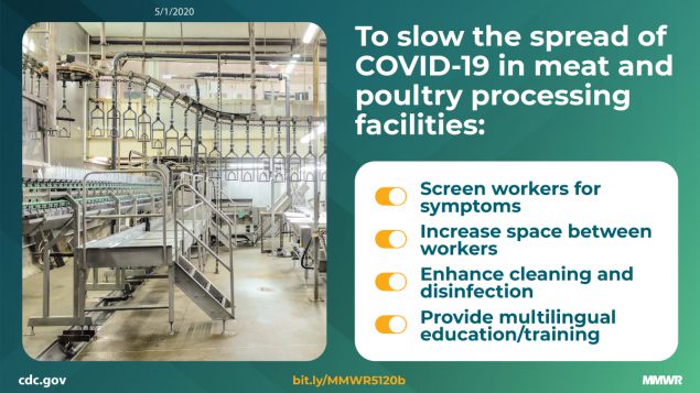 - CDC. Meat and poultry processing workers and employers. Atlanta, GA: US Department of Health and Human Services, CDC; 2020. https://www.cdc.gov/coronavirus/2019-ncov/community/organizations/meat-poultry-processing-workers-employers.html