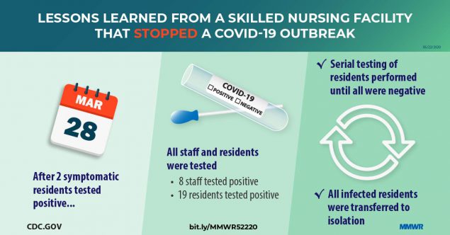 Suggested citation for this article: Dora AV, Winnett A, Jatt LP, et al. Universal and Serial Laboratory Testing for SARS-CoV-2 at a Long-Term Care Skilled Nursing Facility for Veterans — Los Angeles, California, 2020. MMWR Morb Mortal Wkly Rep 2020;69:651–655. DOI: http://dx.doi.org/10.15585/mmwr.mm6921e1.