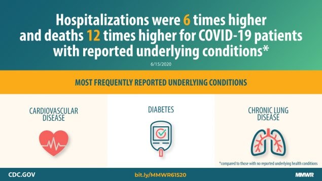 As of May 30, 2020, among COVID-19 cases, the most common underlying health conditions were cardiovascular disease (32%), diabetes (30%), and chronic lung disease (18%). Hospitalizations were six times higher and deaths 12 times higher among those with reported underlying conditions compared with those with none reported.