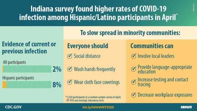 Racial minorities in the nonrandom sample and Hispanics in the random sample experienced higher prevalences than did whites and non-Hispanics, suggesting the need for communication strategies tailored to the culture and languages of local communities, as well as more testing and contact tracing resources to prevent additional infections in these groups. Such initiatives should involve local community leaders who can help mobilize persons to participate despite a potential mistrust of government within these communities (8). The significantly higher observed prevalence in minority communities might have been due in part to social conditions that increased transmission opportunities, including minorities being disproportionately represented among essential workers.