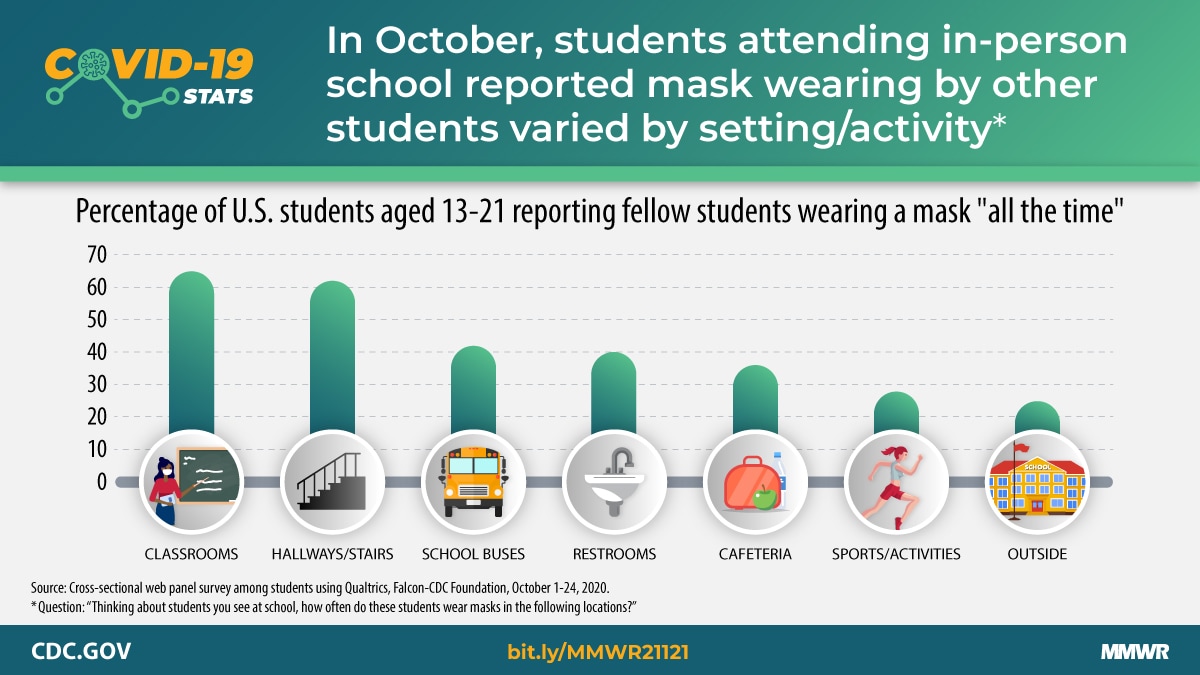 Suggested citation for this article: COVID-19 Stats: Percentage of Middle and High School Students Aged 13–21 Years Attending In-Person Classes Who Reported Observing Fellow Students Wearing a Mask All the Time, by School Setting and Activity — United States, October 2020. MMWR Morb Mortal Wkly Rep 2021;70:223. DOI: http://dx.doi.org/10.15585/mmwr.mm7006a5.