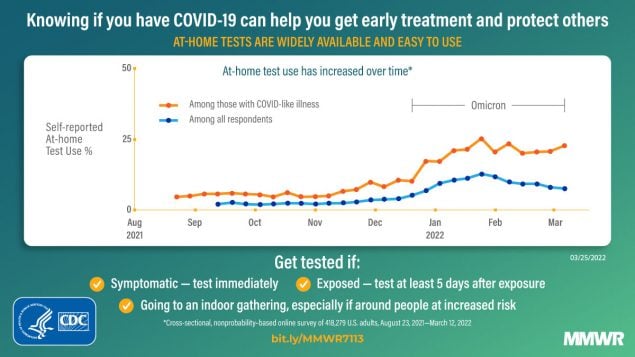 Suggested citation for this article: Rader B, Gertz A, Iuliano AD, et al. Use of At-Home COVID-19 Tests — United States, August 23, 2021–March 12, 2022. MMWR Morb Mortal Wkly Rep 2022;71:489–494. DOI: http://dx.doi.org/10.15585/mmwr.mm7113e1.