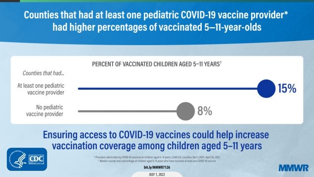 Suggested citation for this article: DeCuir J, Meng L, Pan Y, et al. COVID-19 Vaccine Provider Availability and Vaccination Coverage Among Children Aged 5–11 Years — United States, November 1, 2021–April 25, 2022. MMWR Morb Mortal Wkly Rep 2022;71:847–851. DOI: http://dx.doi.org/10.15585/mmwr.mm7126a3.