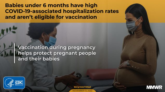 Although these findings do not suggest increased severity of COVID-19 among hospitalized infants, COVID-19–associated hospitalization rates in infants aged <6 months were higher during the Omicron variant–predominant periods (December 2021–August 2022) than they were during previous periods. Maternal vaccination has been shown to provide protection to infants aged <6 months who are currently ineligible for vaccination (9), and both CDC and the American College of Obstetricians and Gynecologists recommend COVID-19 vaccination for women who are pregnant, breastfeeding, trying to get pregnant now, or might become pregnant in the future.§§§§