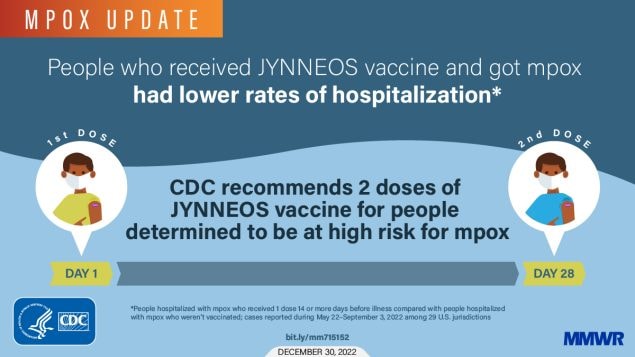The findings in this report are subject to at least four limitations. First, 47% of cases were excluded because of missing vaccination information; therefore, results might not be generalizable to all persons with mpox in the United States. Second, persons with mpox who received vaccine outside of their respective jurisdictions of residence might not have had documentation of vaccine receipt, which could lead to potential undercounting of cases among vaccinated persons (7), although many jurisdictions did report sharing vaccination data with one another (start highlightSarah Gillaniend highlight, District of Columbia Department of Health, personal communication, September 2022). Third, self-reported doses were included to optimize ascertainment of vaccination status, but self-report is less accurate than documented vaccine receipt and could result in misclassification of vaccination status. Finally, clinical data were not available for all cases. In particular, HIV status was unknown or missing for two thirds of vaccinated and more than one half of unvaccinated patients. Because HIV infection might affect the trajectory and illness severity, future studies with additional data for real-world use of JYNNEOS vaccine against clinical outcomes, including data on HIV history, are needed.