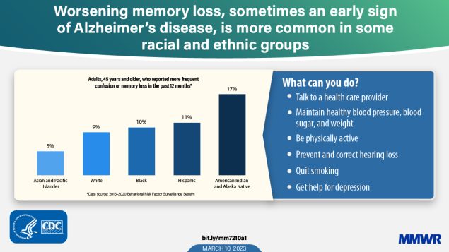 Subjective cognitive decline (SCD), the self-reported experience of worsening or more frequent memory loss or confusion, might be a symptom of early-stage dementia or future serious cognitive decline such as Alzheimer disease* or a related dementia (ADRD) (1). Established modifiable risk factors for ADRD include high blood pressure, inadequate physical activity, obesity, diabetes, depression, current cigarette smoking, and hearing loss (2). An estimated 6.5 million persons aged ≥65 years in the United States live with Alzheimer disease, the most common dementia (1). This number is projected to double by 2060, with the largest increase among non-Hispanic Black or African American (Black), and Hispanic or Latino (Hispanic) adults (1,3). Using data from the Behavioral Risk Factor Surveillance System (BRFSS), CDC assessed racial and ethnic, select demographic, and geographical differences in SCD prevalence, and prevalence of health care professional conversations among those reporting SCD. The age-adjusted prevalence of SCD during 2015–2020 was 9.6% among adults aged ≥45 years (5.0% of Asian or Pacific Islander [A/PI] adults, 9.3% of non-Hispanic White [White] adults, 10.1% of Black adults, 11.4% of Hispanic adults, and 16.7% of non-Hispanic American Indian or Alaska Native [AI/AN] adults). College education was associated with a lower prevalence of SCD among all racial and ethnic groups. Only 47.3% of adults with SCD reported that they had discussed confusion or memory loss with a health care professional. Discussing changes in cognition with a physician can allow for the identification of potentially treatable conditions, early detection of dementia, promotion of dementia risk reduction behaviors, and establishing a treatment or care plan to help adults remain healthy and independent for as long as possible.