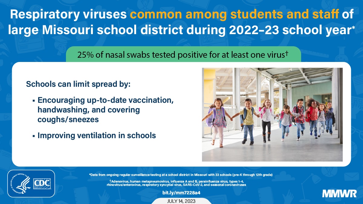 To determine the prevalence of respiratory viruses in school students and staff members, prospective surveillance was implemented in a large metropolitan school district in Kansas City, Missouri with 33 pre-Kindergarten (pre-K)–grade 12 schools during the 2022–23 school year. All district students and staff members were eligible to enroll in opt-in respiratory virus testing and symptom surveys irrespective of the presence of symptoms; enrollment information was sent by the school district using existing communication channels. Self-collected anterior nasal swabs were obtained monthly and tested using multiplex viral polymerase chain reaction.* Thirty-six hours before each scheduled monthly test, an electronic survey was sent to enrolled participants (or their parent or guardian) inquiring about respiratory virus infection symptoms during the preceding 7 days. Logistic regression models were used to compare positivity across age groups. Regression models accounted for clustering within schools when calculating cluster-robust SEs. Percentile-based bootstrapped CIs were calculated using Stata 17 software (version 17.0; StataCorp). The goal of this report is to share timely virus testing results during ongoing surveillance. This activity was reviewed by CDC and was conducted consistent with applicable federal law and CDC policy.§