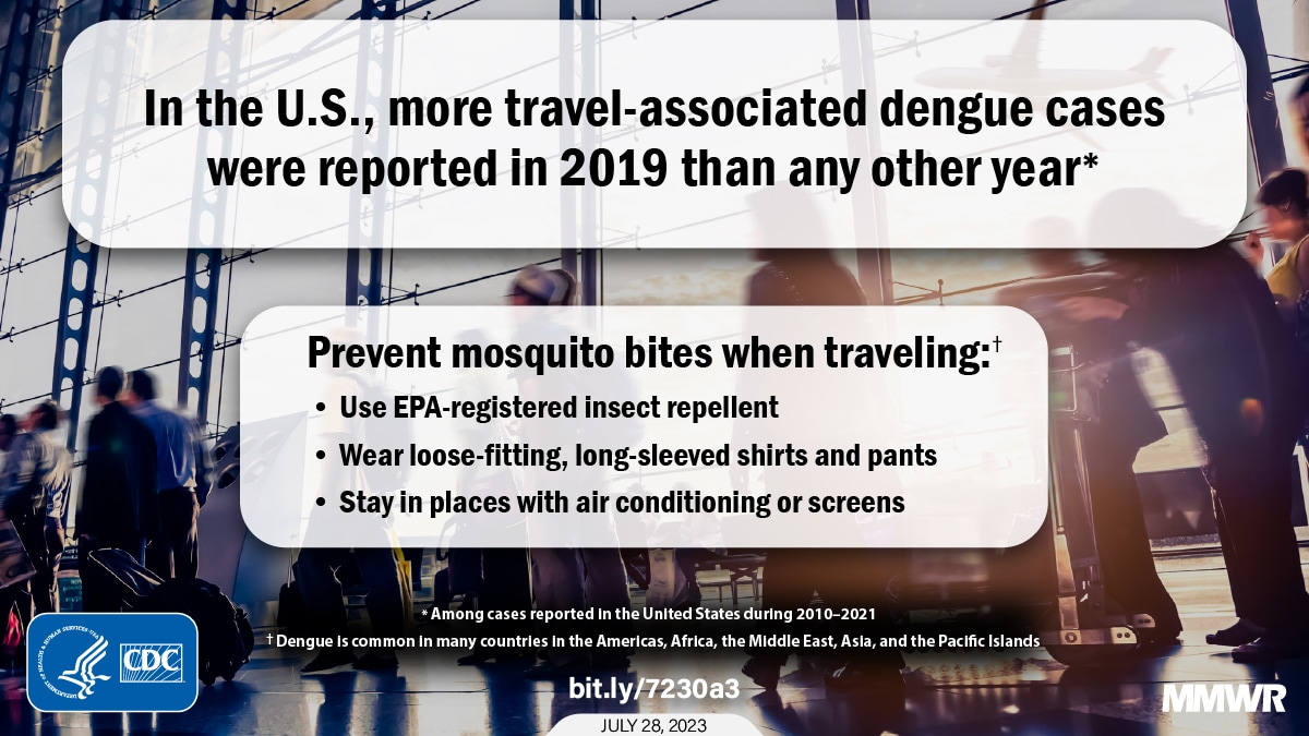 Suggested citation for this article: Wong JM, Rivera A, Volkman HR, et al. Travel-Associated Dengue Cases — United States, 2010–2021. MMWR Morb Mortal Wkly Rep 2023;72:821–826. DOI: http://dx.doi.org/10.15585/mmwr.mm7230a3.