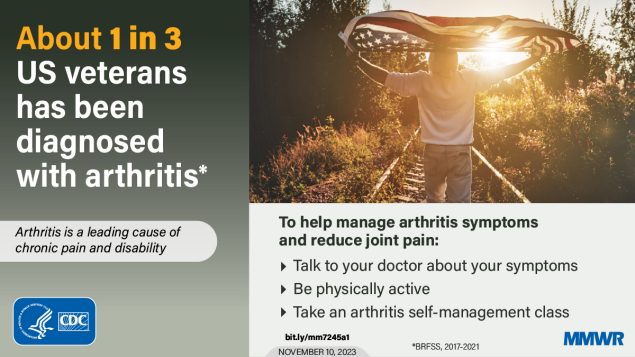 Arthritis is a chronic inflammatory condition that can lead to chronic pain and disability. U.S. veterans experience higher rates of diagnosed arthritis than nonveterans.