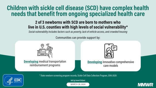 The finding that most mothers lived in counties with high or very high SVI highlights the insights that county-level data can provide to public health policymakers when considering the support that community-based programs can deliver to meet the complex health needs of newborns with SCD and their caregivers. The majority (64%) of mothers of newborns with SCD resided in counties with high or very high housing type and transportation social vulnerability, underscoring potential strategies to serve these communities, including medical transportation programs or development of innovative care models to facilitate access to comprehensive SCD care. For example, improving flexibility in scheduling of medical transportation, providing reimbursement for use of existing public transportation such as rideshares, and partnering with local faith- and community-based organizations for medical transport have the potential to improve access to care. Moreover, understanding the geographic location of SCD-affected newborns within a state can help guide specialty and primary care efforts to improve access to SCD care. Together, these findings provide data to Medicaid programs, the primary payer for SCD care,†† as they collaborate with state agencies to consider the effect of housing and transportation vulnerabilities on infants with SCD. These Medicaid programs can also support partnerships created by public health programs, the communities they serve, and community-based organizations to ascertain specific resource needs of SCD-affected populations, as well as where and how resources can be deployed to drive more equitable outcomes.