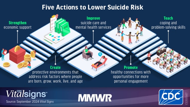 In 2022, approximately 49,000 persons died by suicide in the United States. A comprehensive approach that addresses health-related community factors, such as health care access, social and community context, and economic stability, could help prevent suicide.