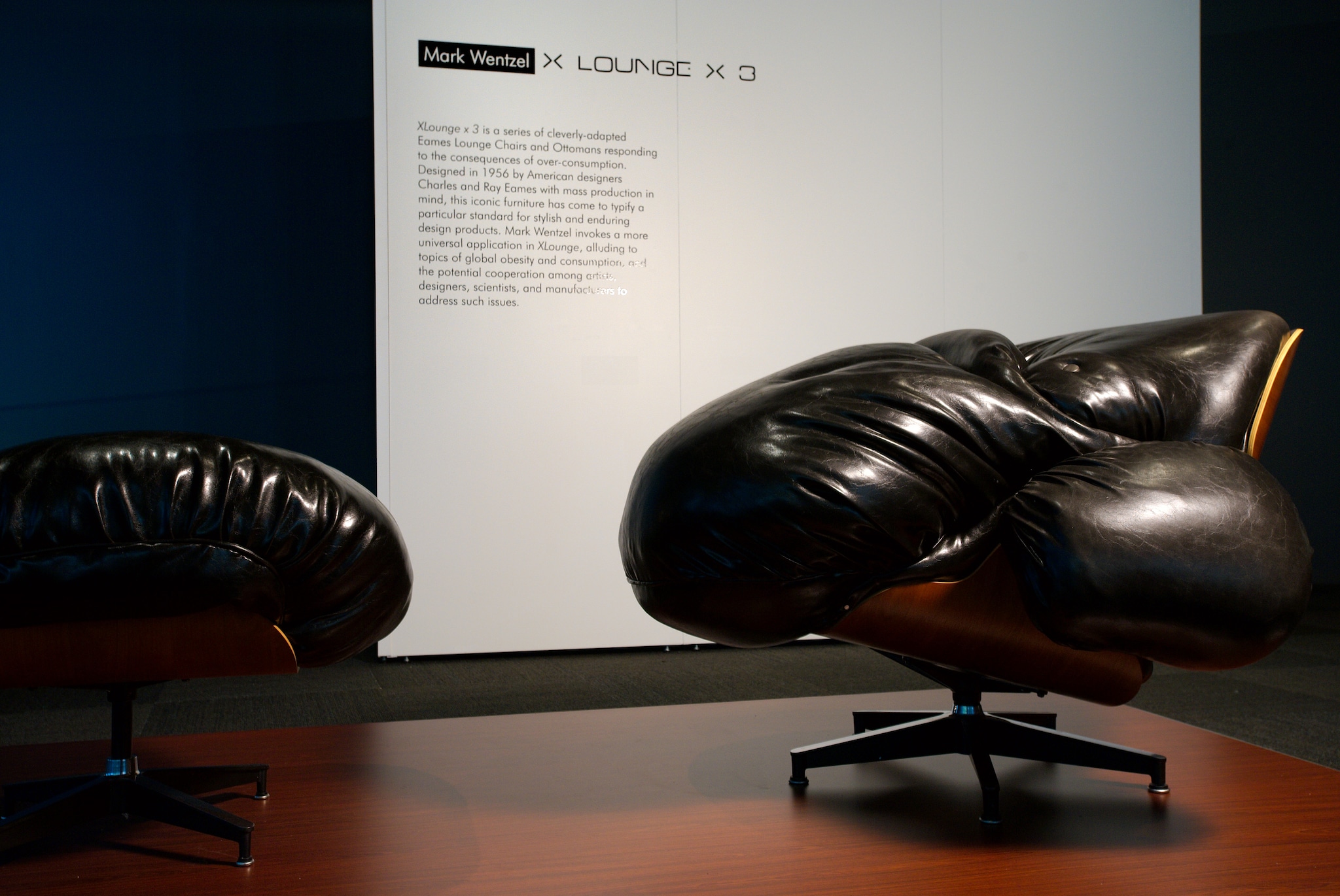 XLounge x 3 was a series of cleverly-adapted Eames Lounge Chairs and Ottomans responding to the apparent consequences of the over-consumption of goods and materials of recent years. Designed in 1956 by the legendary American designers Charles and Ray Eames with mass production in mind, this iconic furniture has come to typify a particular standard for stylish and enduring design products. Artist Mark Wentzel invoked a more universal application in XLounge, alluding to topics of global obesity and consumption, and the potential cooperation among artists, designers, scientists and manufacturers to address such issues.