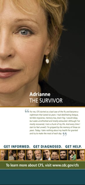 The Faces of Chronic Fatigue Syndrome featured huge, full–color portraits (shot by celebrity and fashion photographer George Lange) of eight CFS patients and two CFS experts and included quotes from each about their experiences with this disease. Together, the 10 banners and their first–person accounts told a compelling story about CFS and how it affects lives. The exhibition also included important information about symptoms and diagnosis so people who suspect they have the illness, but haven’t yet been diagnosed, could find the information and help they needed. The Faces of Chronic Fatigue Syndrome was part of the national public awareness campaign sponsored by the CDC and the CFIDS Association of America.