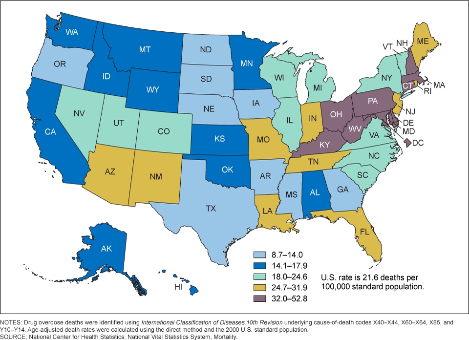 The age-adjusted rate for drug overdose deaths in the United States for 2019 was 21.6 per 100,000 standard population (Figure 1, Table). The five states with the highest rates were West Virginia (52.8), Delaware (48.0), District of Columbia (43.2), Ohio (38.3), and Maryland (38.2). The five states with the lowest rates were Nebraska (8.7), South Dakota (10.5), Texas (10.8), North Dakota (11.4), and Iowa (11.5).