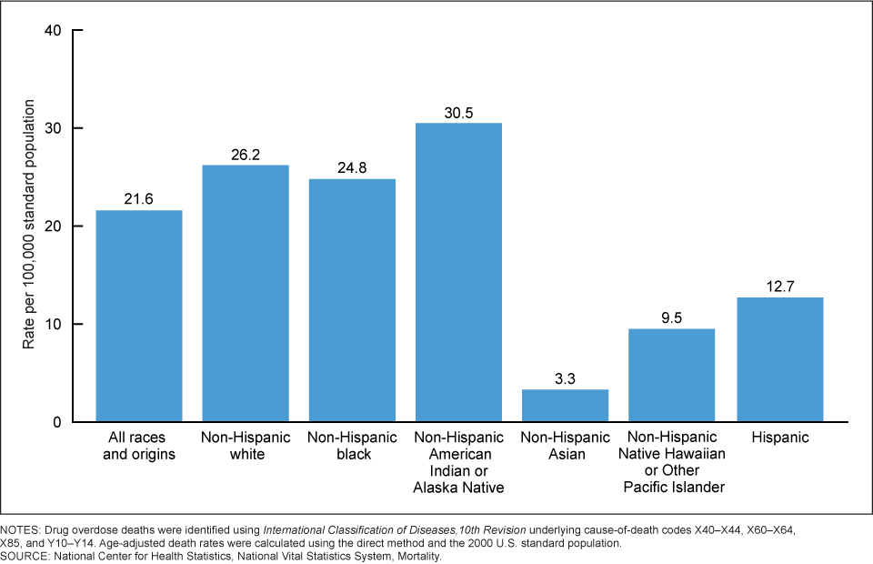The age-adjusted drug overdose death rate for the non-Hispanic white population in 2019 (26.2 per 100,000 standard population) was 21.3% higher than the national rate (Figure 2). The rate for the non-Hispanic black population (24.8) was 14.8% higher than the national rate. The rate for the non-Hispanic American Indian or Alaska Native population (30.5) was 41.2% higher than the national rate. The rate for the non-Hispanic Asian population (3.3) was 84.7% lower than the national rate. The rate for the non-Hispanic Native Hawaiian or Other Pacific Islander population (9.5) was 56.0% lower than the national rate. The rate for the Hispanic population (12.7) was 41.2% lower than the national rate.
