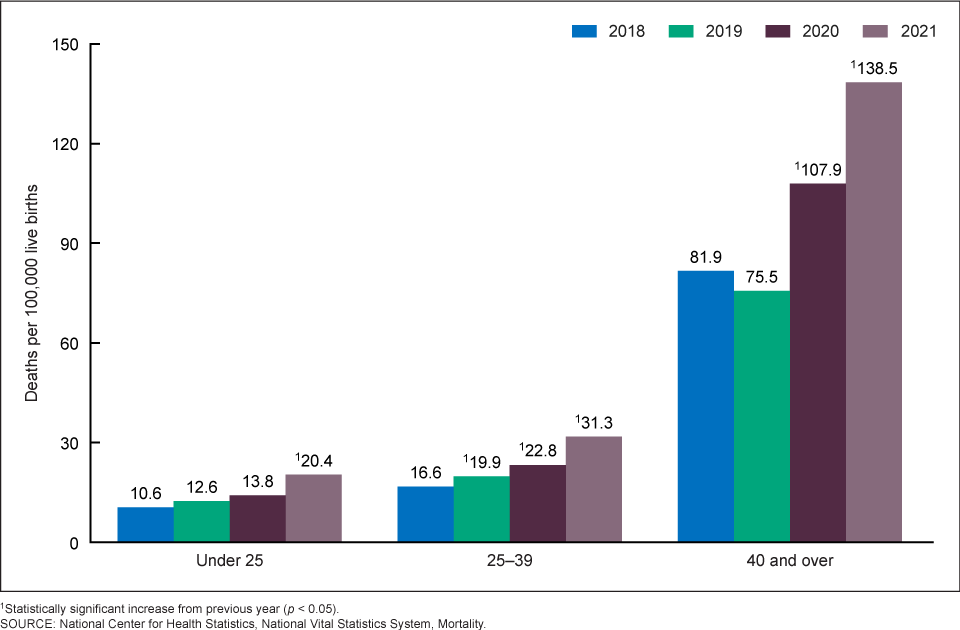 This is a bar chart of the maternal mortality rates by age. The rates increase with increasing age. The increase between 2020 and 2021 is statistically significant for women age under 25, 25–39, and 40 and over.