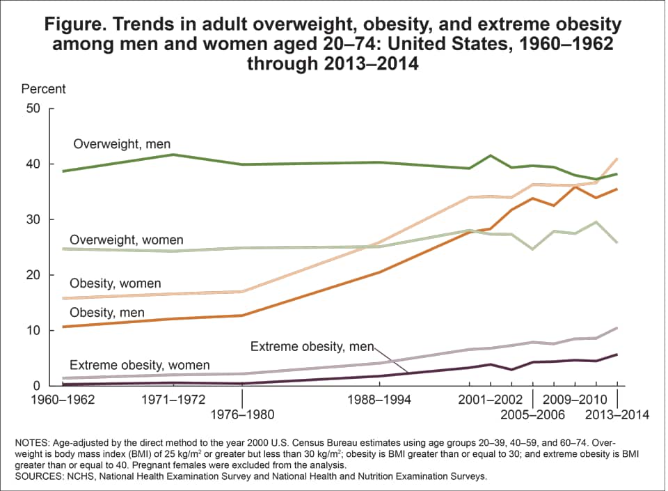 Prevalence of Overweight, Obesity, and Extreme Obesity Among Adults Aged 20 and Over: United States, 1960–1962 Through 2013–2014