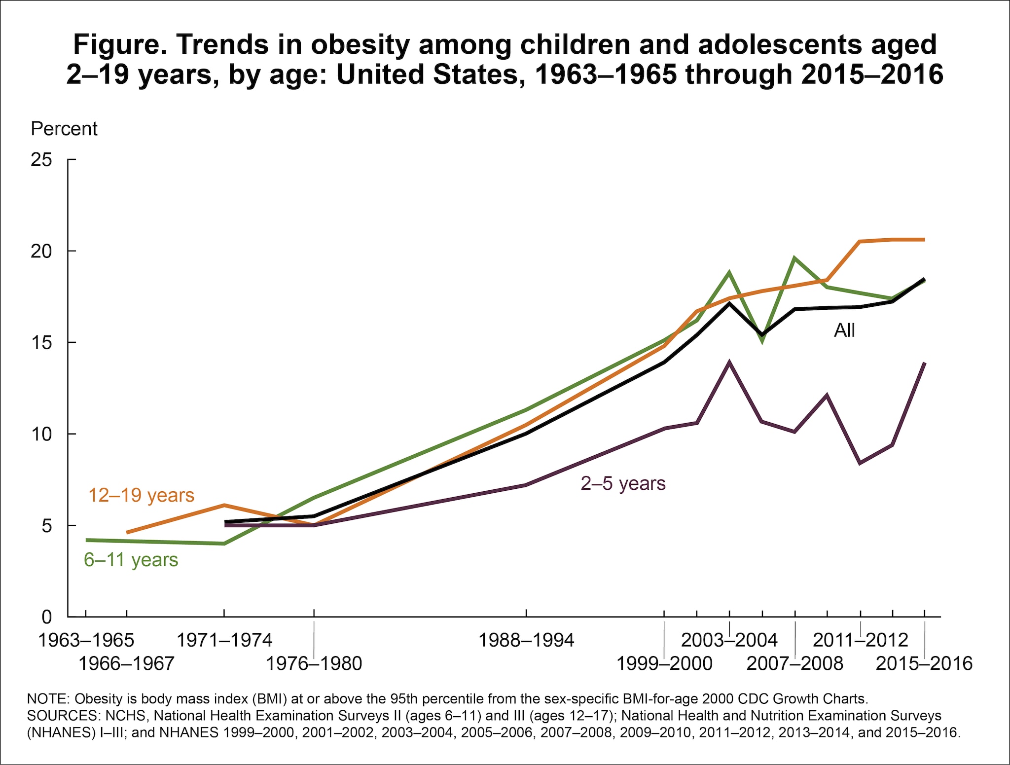 Figure. Trends in obesity among children and adolescents aged 2–19 years, by age: United States, 1963–1965 through 2015–2016