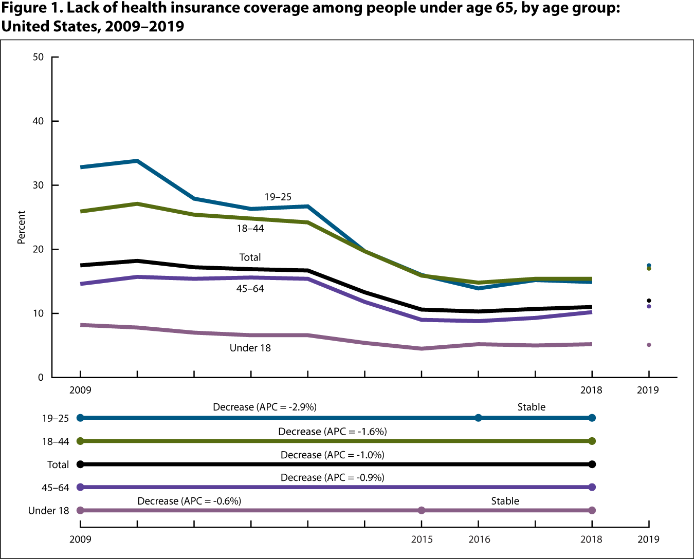 Among those under age 65, adults aged 18–44 were the most likely to be uninsured during 2009–2019.
