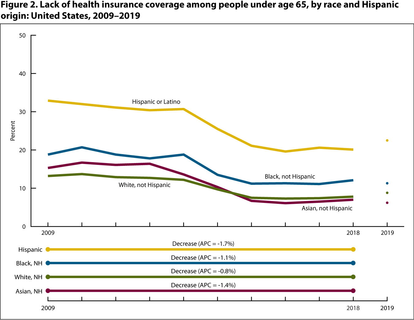 - From 2009 to 2018, the percentage of people under age 65 who were uninsured decreased at varying rates for Hispanic (from 32.9% to 20.1%), non-Hispanic Black (from 18.8% to 12.1%), non-Hispanic White (from 13.2% to 7.8%), and non-Hispanic Asian (from 15.3% to 7.0%) people.