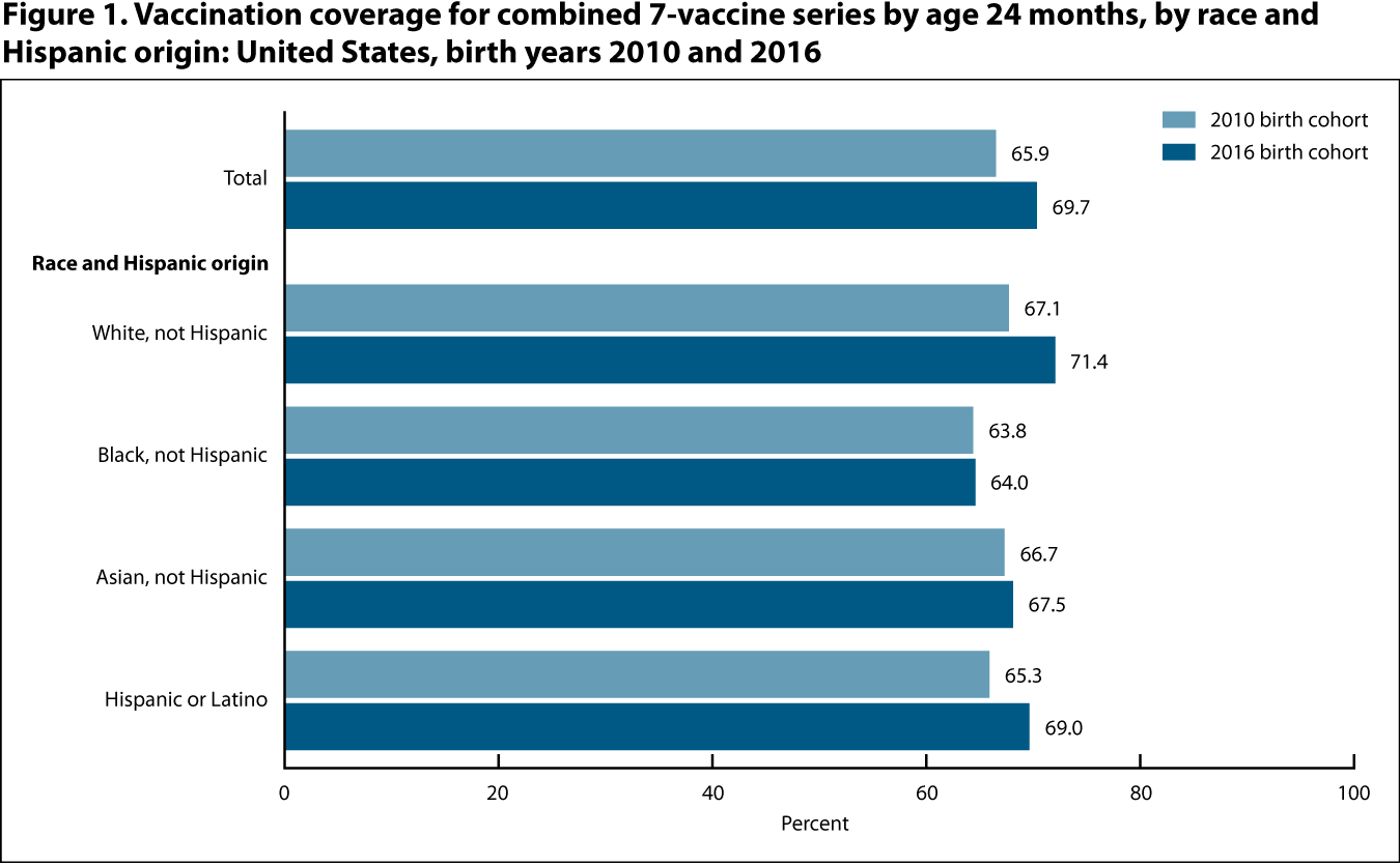 - For both the 2010 and 2016 birth cohorts, non-Hispanic Black children were less likely to receive the combined 7-vaccine series than non-Hispanic White children. Vaccination coverage for non-Hispanic Asian and Hispanic children did not differ from non-Hispanic Black or non-Hispanic White children.