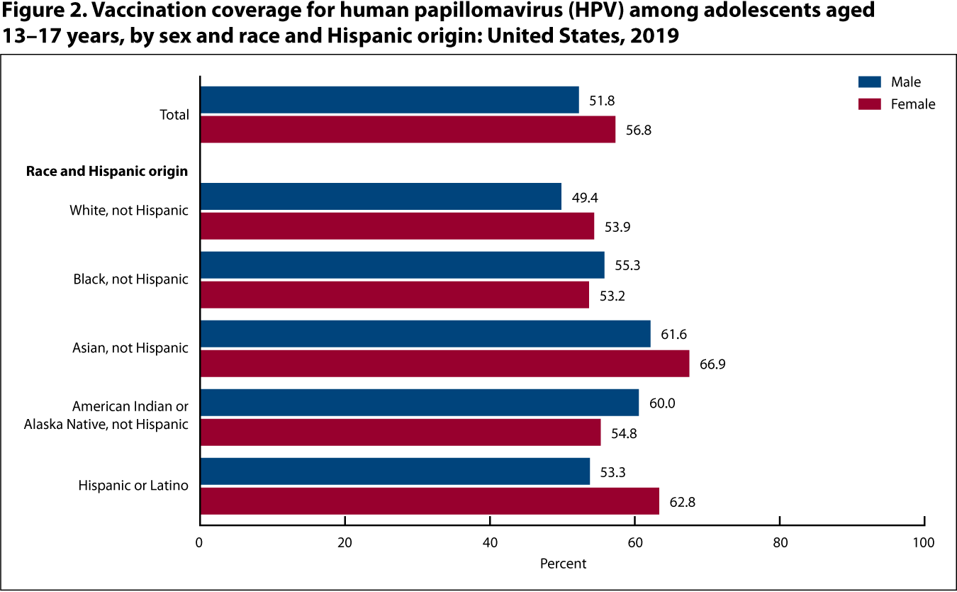 - Among non-Hispanic White and Hispanic adolescents, females were more likely to be fully vaccinated against HPV than males in 2019. HPV vaccination coverage was not different by sex among other race and Hispanic-origin groups.
