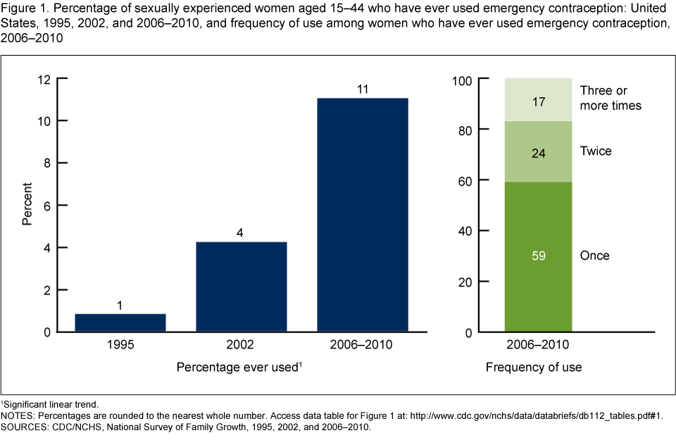 Daniels K, Jones J, Abma J. Use of emergency contraception among women aged 15-44: United States, 2006-2010. NCHS data brief, no 112. Hyattsville, MD: National Center for Health Statistics. 2013.