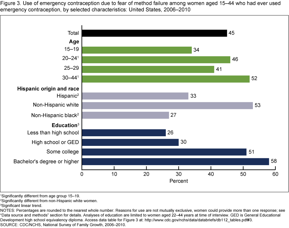 - Nearly one-half of women who had ever used emergency contraception reported fear of method failure as a reason for use, but variation occurred by age, Hispanic origin and race, and education.