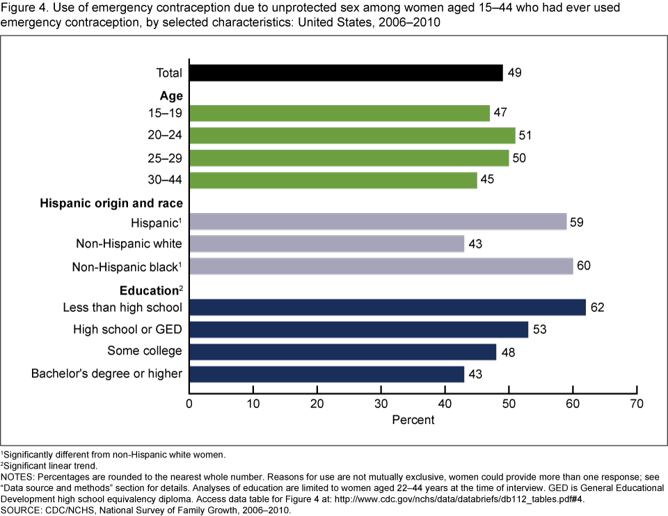 - Nearly one-half of women who had ever used emergency contraception gave having unprotected sex as a reason for use, but variation occurred across Hispanic origin and race, and education.