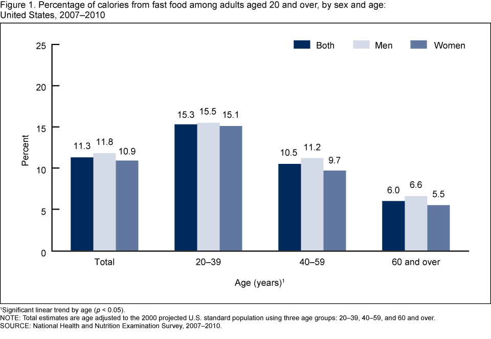 - During 2007–2010, adults consumed, on average, 11.3% of their total daily calories from fast food.
