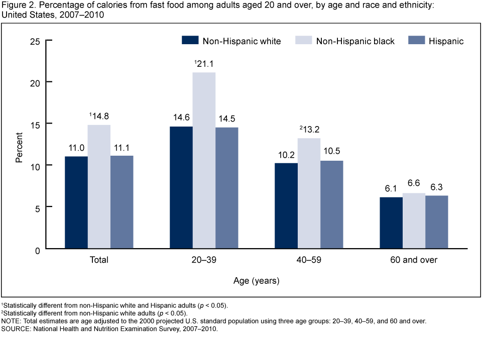 - Non-Hispanic black adults consumed a higher percentage of calories from fast food compared with non-Hispanic white and Hispanic adults.