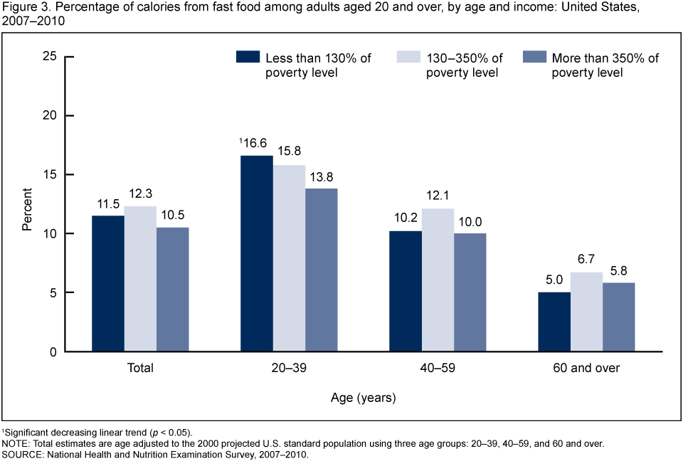 - No difference was observed by income status in the percentage of calories consumed from fast food among all adults. Among young adults, however, as income increased, the percentage of calories from fast food decreased.