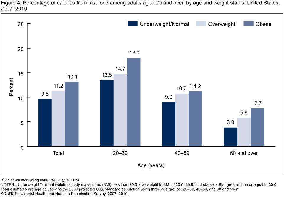 During 2007–2010, the highest percentage of calories from fast food was consumed among adults who were aged 20–39 or non-Hispanic black or obese. Among young non-Hispanic black adults, more than one-fifth of their calories were consumed from fast food.