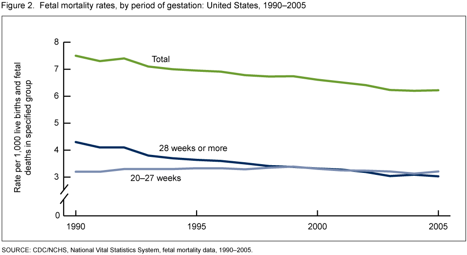 - After decades of decline, the U.S. fetal mortality rate (fetal deaths of 20 weeks of gestation or more) did not decrease from 2003 to 2005.