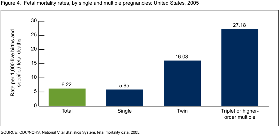 The fetal mortality rate for twin pregnancies (16.08) was 2.7 times the rate for singleton pregnancies (5.85). The fetal mortality rate for triplet and higher-order pregnancies (27.18) was 4.6 times the rate for singleton pregnancies.