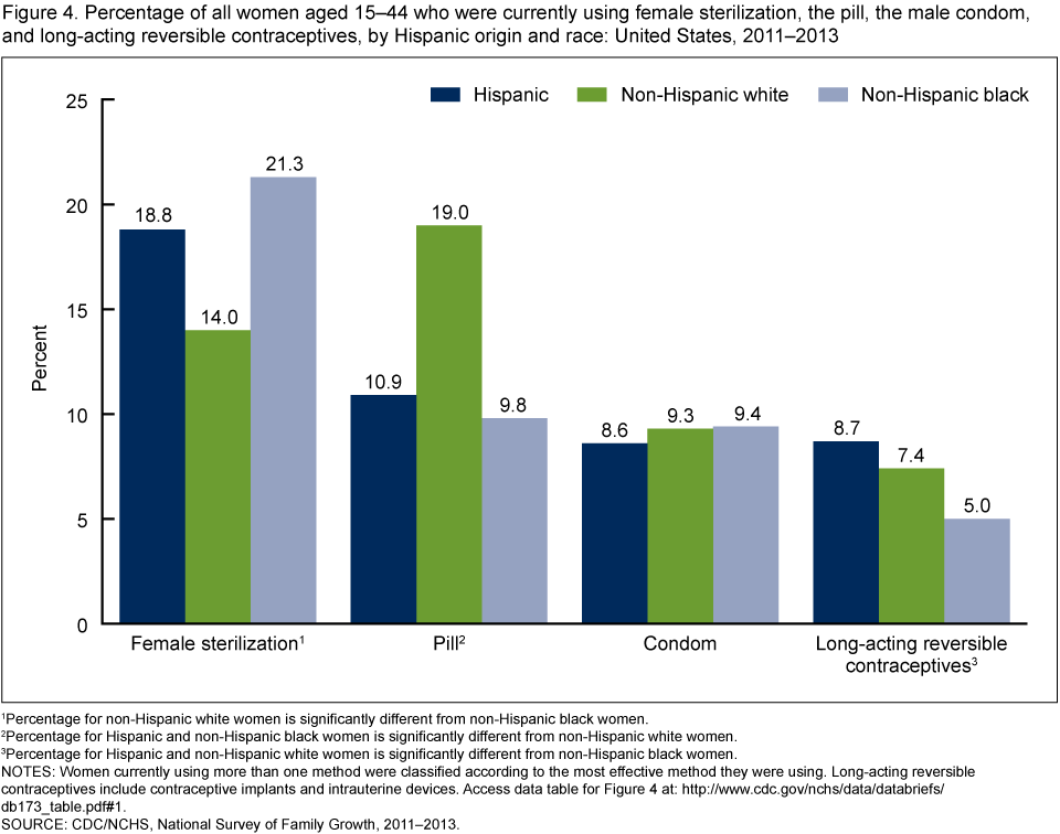 Figure 4. Percentage of all women aged 15–44 who were currently using female sterilization, the pill, the male condom, and long-acting reversible contraceptives, by Hispanic origin and race: United States, 2011–2013
