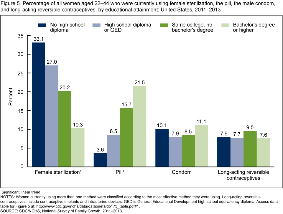 Figure 5. Percentage of all women aged 22–44 who were currently using female sterilization, the pill, the male condom, and long-acting reversible contraceptives, by educational attainment: United States, 2011–2013