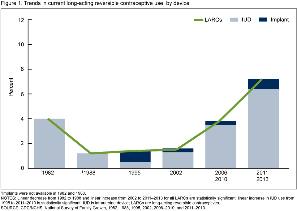 Branum AM, Jones J. Trends in long-acting reversible contraception use among U.S. women aged 15–44. NCHS data brief, no 188. Hyattsville, MD: National Center for Health Statistics. 2015.
