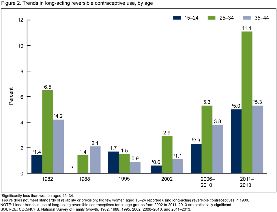 - Use of long-acting reversible contraceptives (LARCs) declined between 1982 and 1988, remained stable through 2002, and then increased nearly five-fold in the last decade among women aged 15–44, from 1.5% in 2002 to 7.2% in 2011–2013.