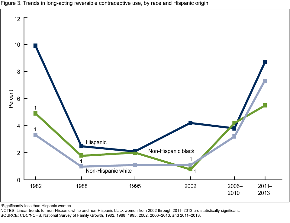 - Decreases in LARC use were similar for Hispanic, non-Hispanic white, and non-Hispanic black women from 1982 to 1988 and remained stable for each race and Hispanic origin group from 1988 to 1995. However, after 1995, patterns of use diverged (Figure 3).