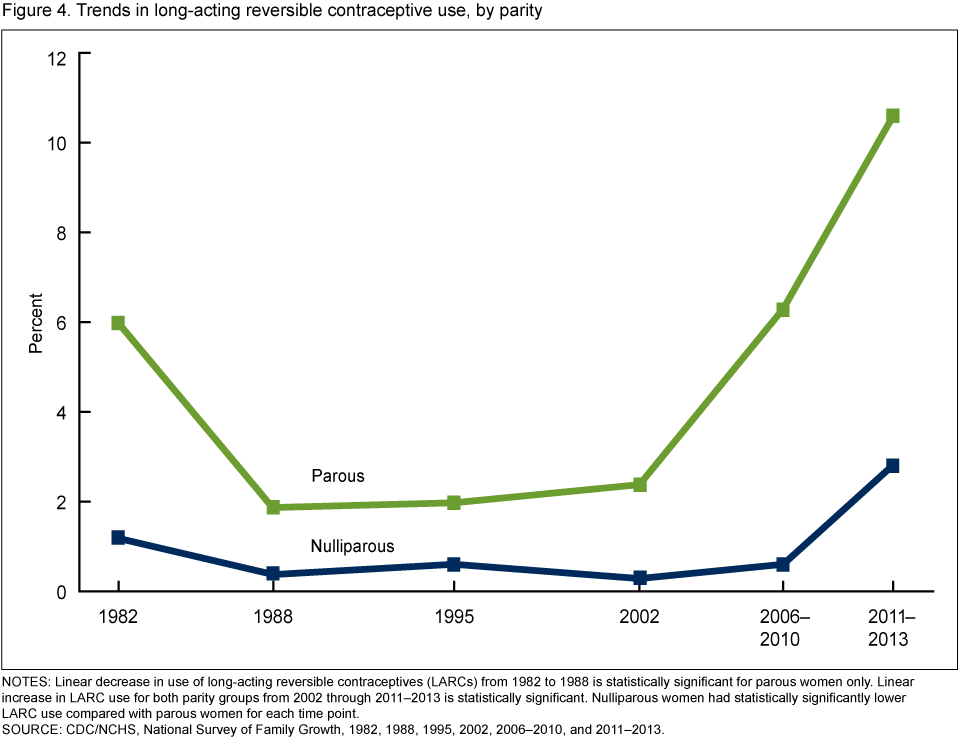 - Among parous women, LARC use declined between 1982 and 1988 and remained stable until 2002, when it increased two and one-half times between 2002 (2.4%) and 2006–2010 (6.3%), and then increased nearly 70% from 2006–2010 to 2011–2013 (10.6%).
