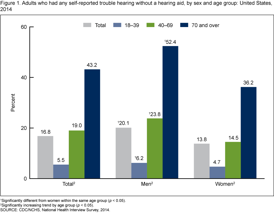 In 2014, one in six adults aged 18 and over (16.8%) had any self-reported trouble hearing without a hearing aid (Figure 1). The percentage with any trouble hearing increased significantly overall with age: 5.5% among adults aged 18–39, 19.0% among adults aged 40–69, and 43.2% among adults aged 70 and over. In each age group, men were more likely than women to have had trouble hearing. Among adults aged 70 and over, 52.4% of men had trouble hearing without a hearing aid compared with 36.2% of women.