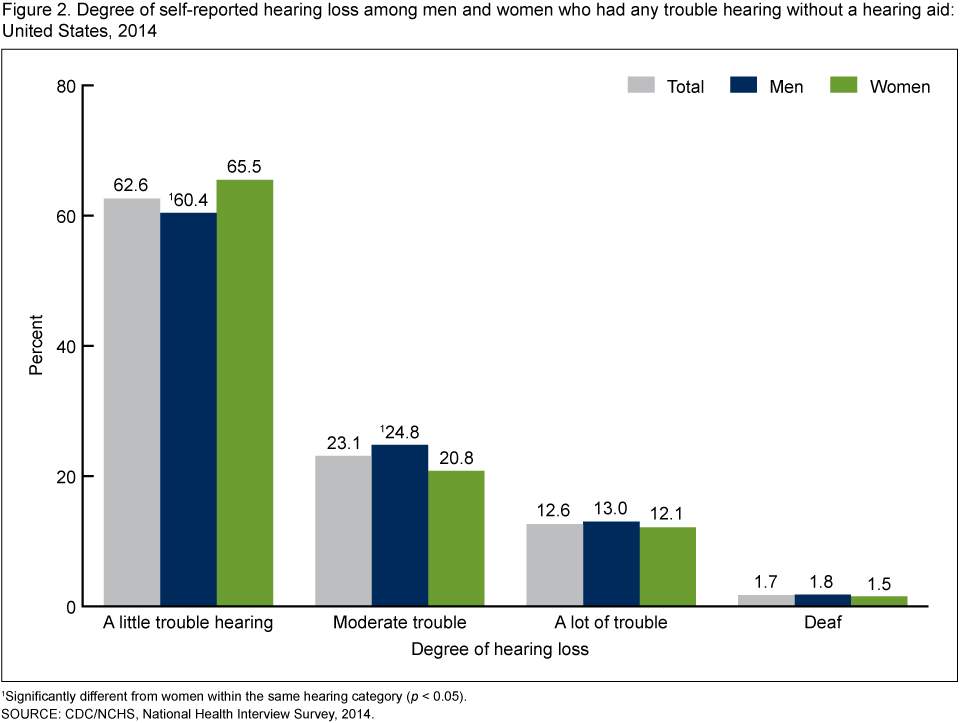 Figure 2. Degree of self-reported hearing loss among men and women who had any trouble hearing without a hearing aid: United States, 2014