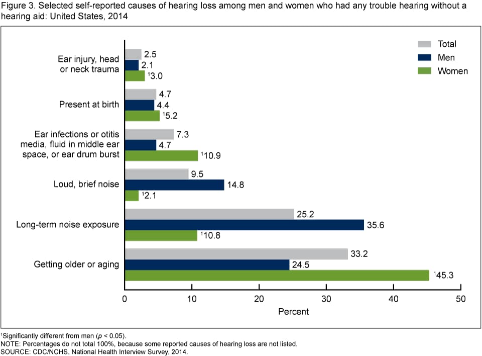 Figure 3. Selected self-reported causes of hearing loss among men and women who had any trouble hearing without a hearing aid: United States, 2014
