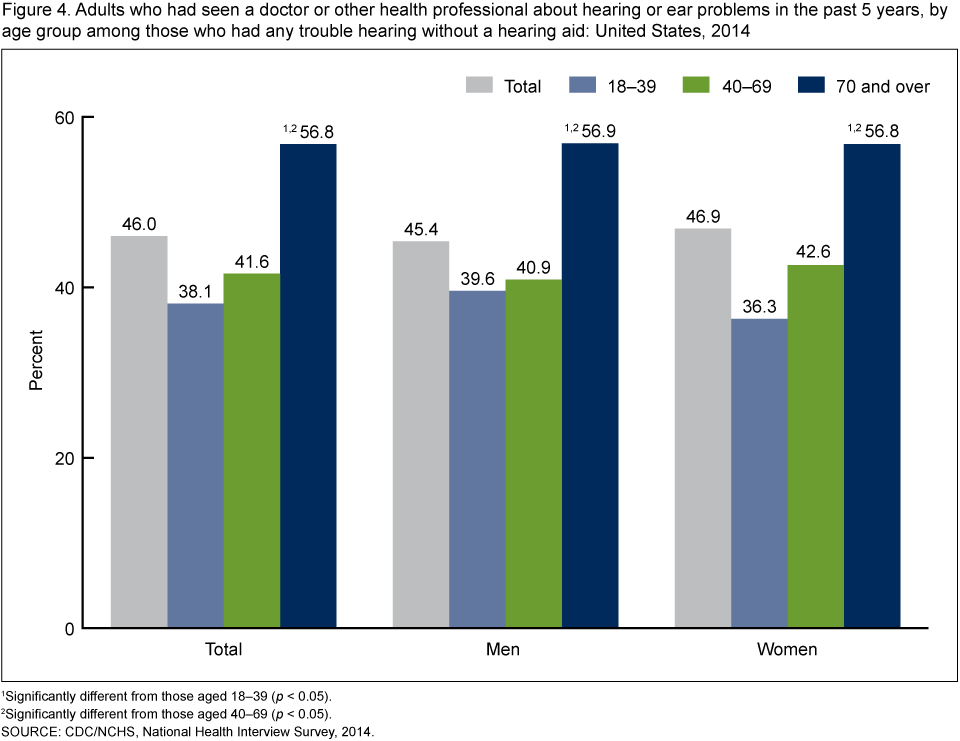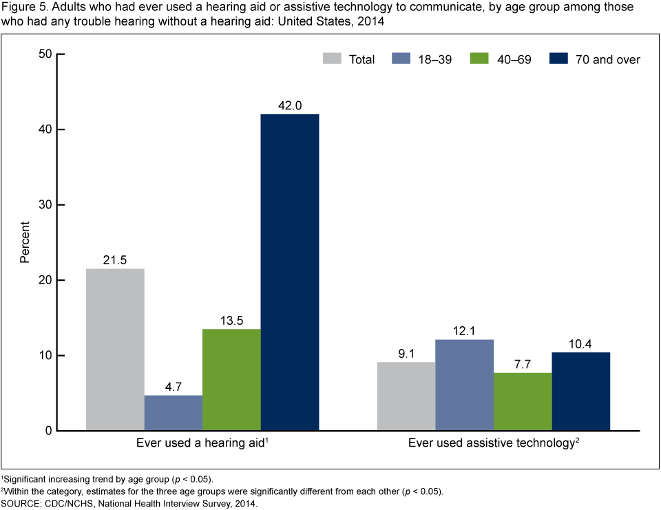 Among U.S. adults aged 70 and over who had any trouble hearing, 56.8% had seen a doctor or other health care professional about their hearing or ear problems in the past 5 years, but only 42.0% had ever used a hearing aid. Younger adults (aged 18–39) who had any trouble hearing were even less likely to have seen a doctor or used a hearing aid, but they were more likely to have used other assistive technology because of their hearing compared with adults aged 40–69 or 70 and over.