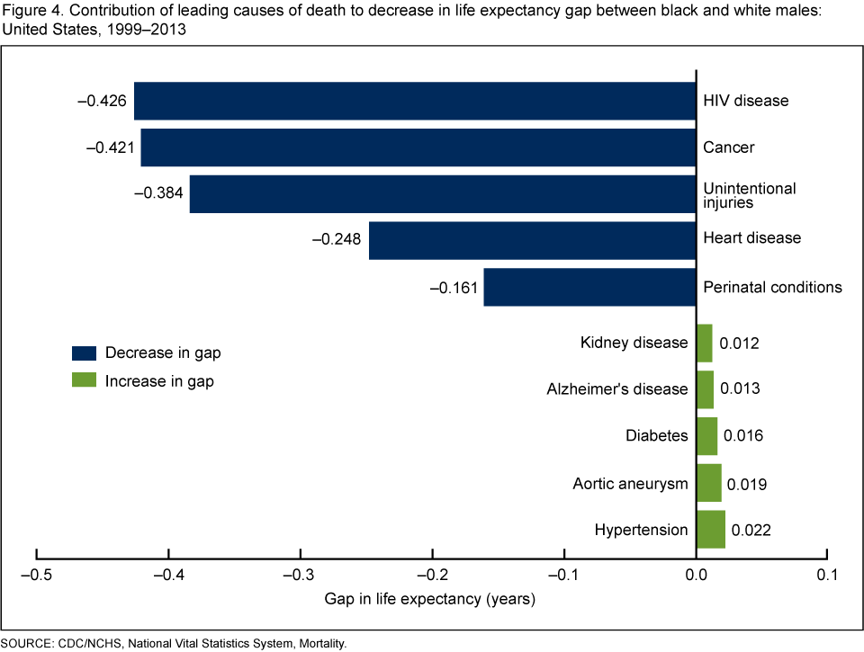 - Greater decreases in HIV disease mortality alone accounted for 0.426 year in the decrease in the gap in life expectancy between black and white males.
